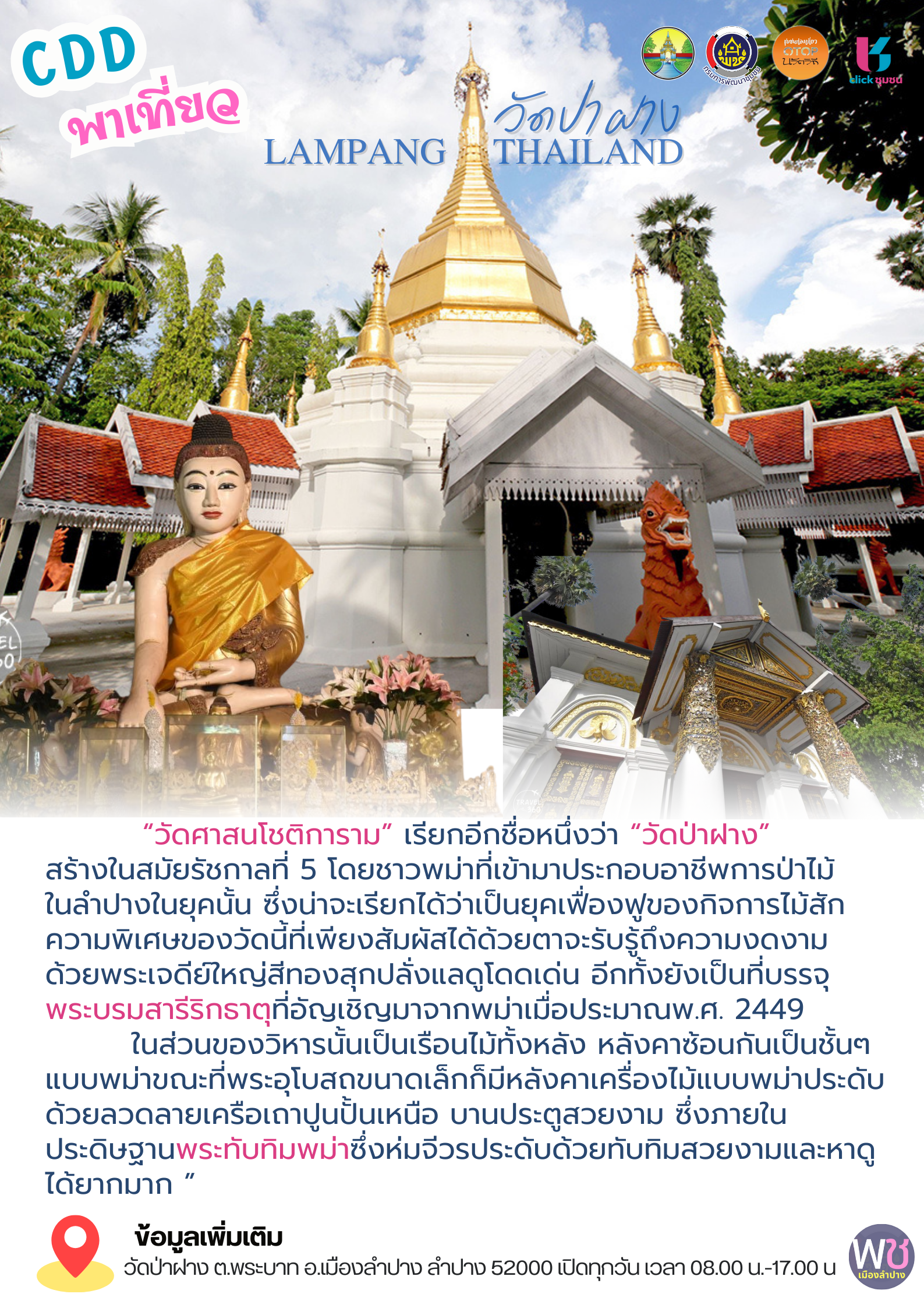พิกัด : วัดป่าฝาง ตำบลพระบาท อำเภอเมืองลำปาง จังหวัดลำปาง เปิดทุกวัน เวลา ๐๘.๐๐ น.-๑๗.๐๐ น