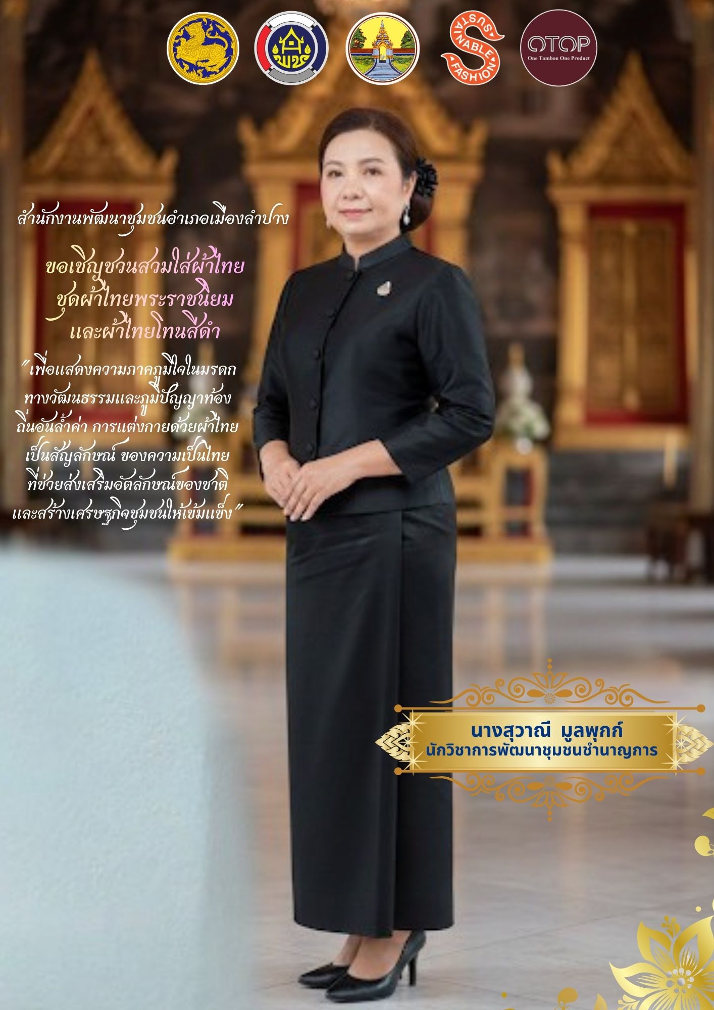 🔹️ สำนักงานพัฒนาชุมชนอำเภอเมืองลำปาง ขอเชิญชวนทุกท่านสวมใส่ผ้าไทย ชุดไทยพระราชนิยมและผ้าไทยโทนสีดำ สืบสานมรดกแห่งความเป็นไทย มรดกแห่งความภาคภูมิใจความเป็นไทย เพื่ออนุรักษ์และสืบสานเอกลักษณ์ความเป็นไทย อันเป็นมรดกทางวัฒนธรรมอันทรงคุณค่า และเพื่อน้อมรำลึกในพระมหากรุณาธิคุณของ สมเด็จพระนางเจ้าสิริกิติ์ พระบรมราชินีนาถ พระบรมราชชนนีพันปีหลวง ผู้ทรงเป็นแบบอย่างในการอนุรักษ์ผ้าไทยและส่งเสริมอาชีพให้กับประชาชนทั่วประเทศ